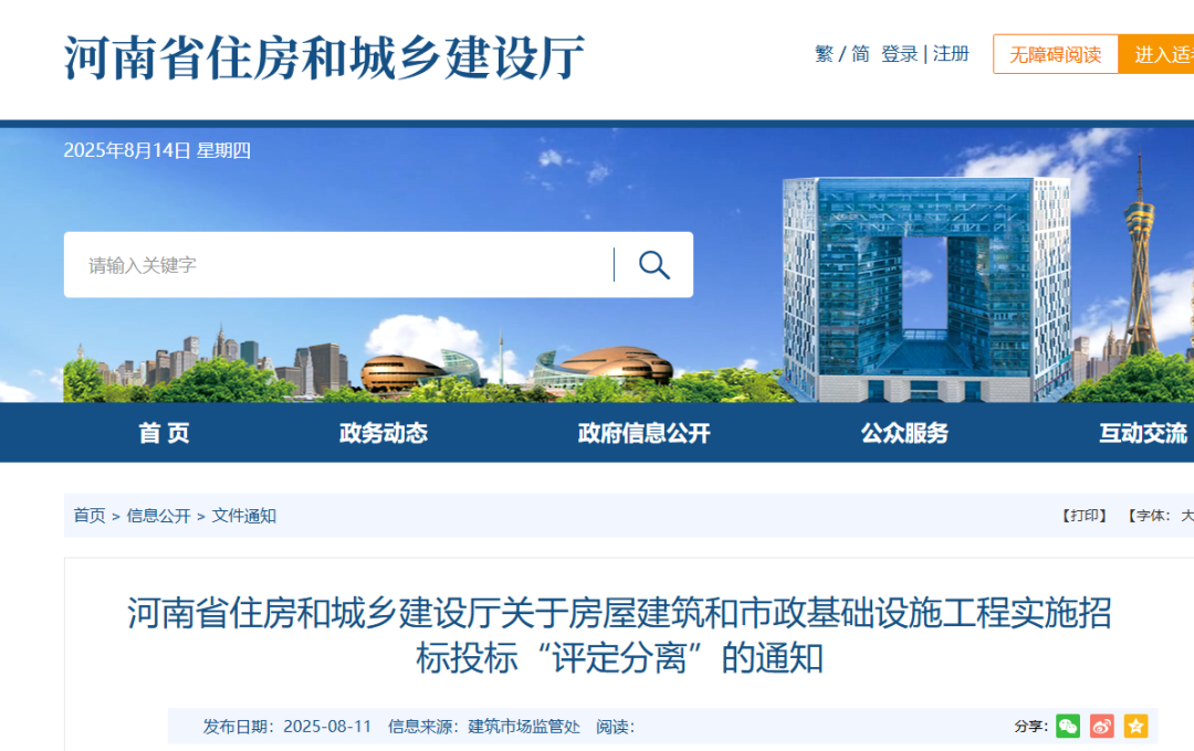 • 住建廳:全省政府投資工程實施“評定分離”,即日起實施!2025-08-15